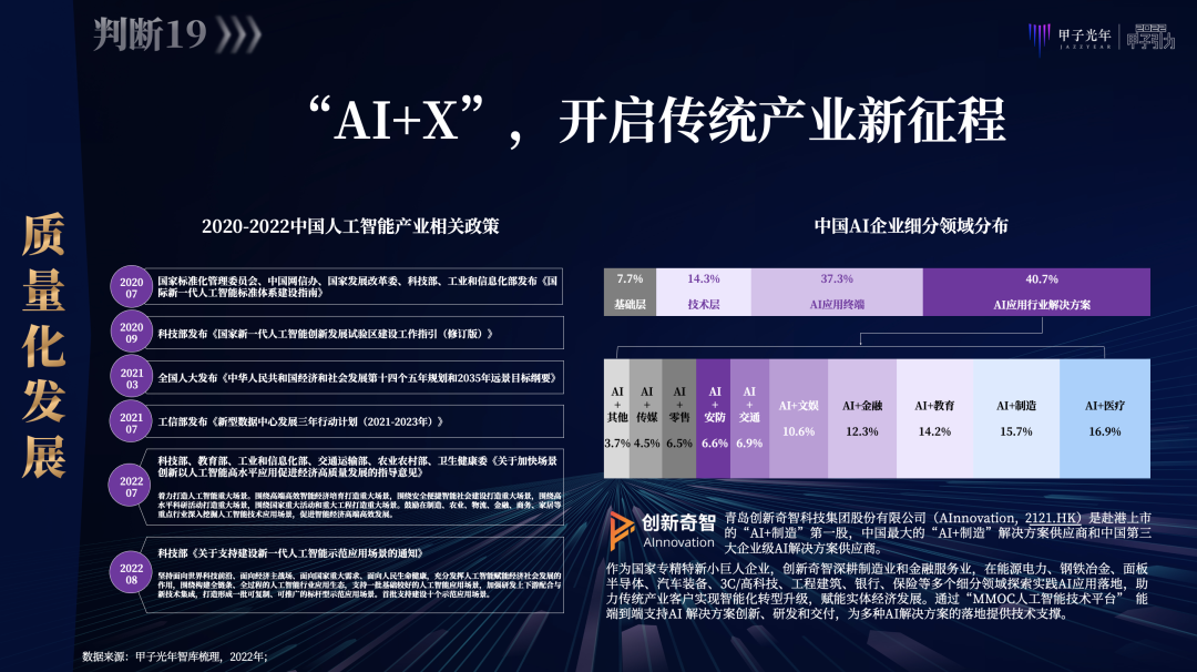以制造业为例,目前AI已经可以成功部署在制造业的各个环节,并且越来越靠近关键业务。比如创新奇智就是一家深耕AI+制造业的代表,其在面板半导体、汽车装备、3C等多个细分领域实践AI应用落地,其“MMOC人工智能技术平台”积累了产品缺陷质量检测、生产现场安全管理、智能生产计划、智能化运维等丰富的最佳实践,帮助制造业客户实现智能化转型升级。与此同时,创新奇智在银行、保险等金融服务业也持续深耕,均实现AI应用落地,助力传统产业转型升级,赋能实体经济发展。