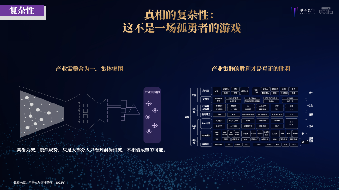 这就到了比拼战略定力的时候。 元宇宙要解决的不是一个单点问题,需要各类角色齐心协力,政策耐心,产业务实,技术突围,合力实现突破。