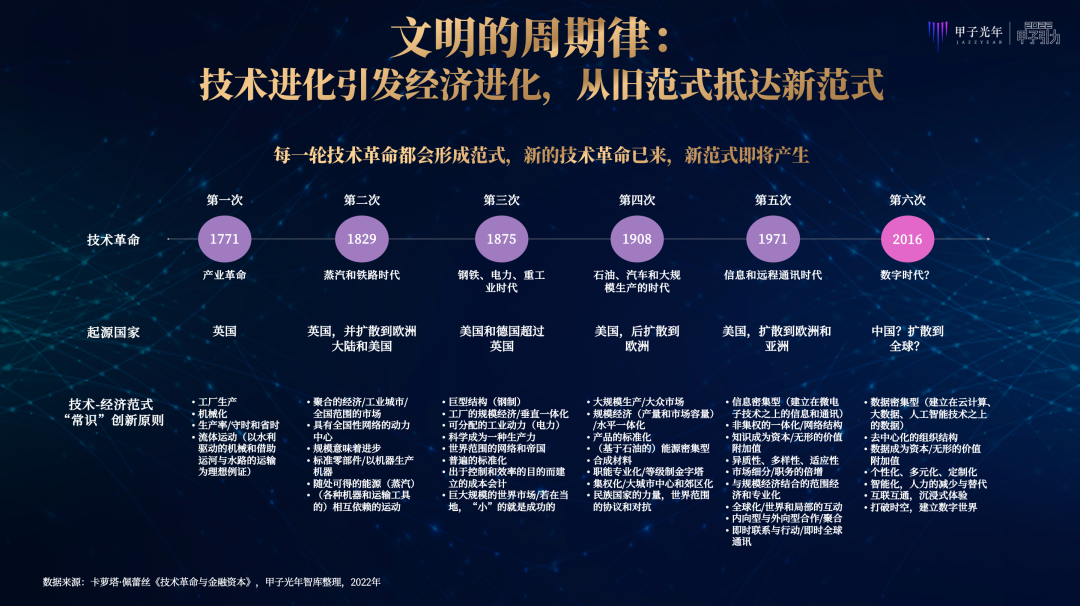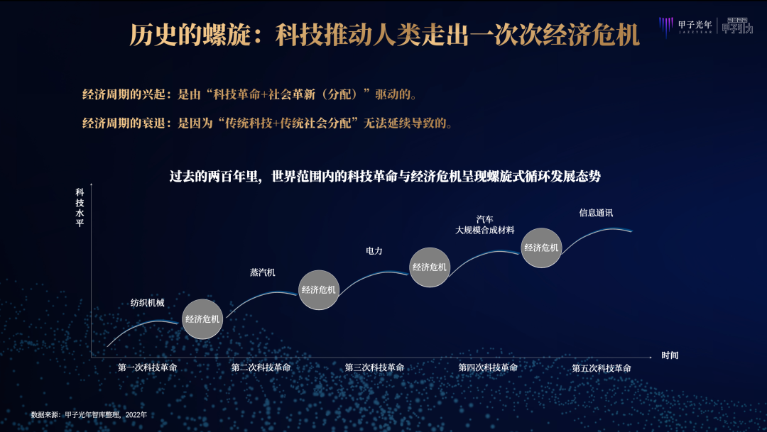 回望历史,人类社会一直在繁荣与衰退、乐观与悲观的循环中发展。近200年来,一共发生过5次世界范围内的科技革命,从周期来看,经济危机与科技革命总是互为前提、交替发生 。