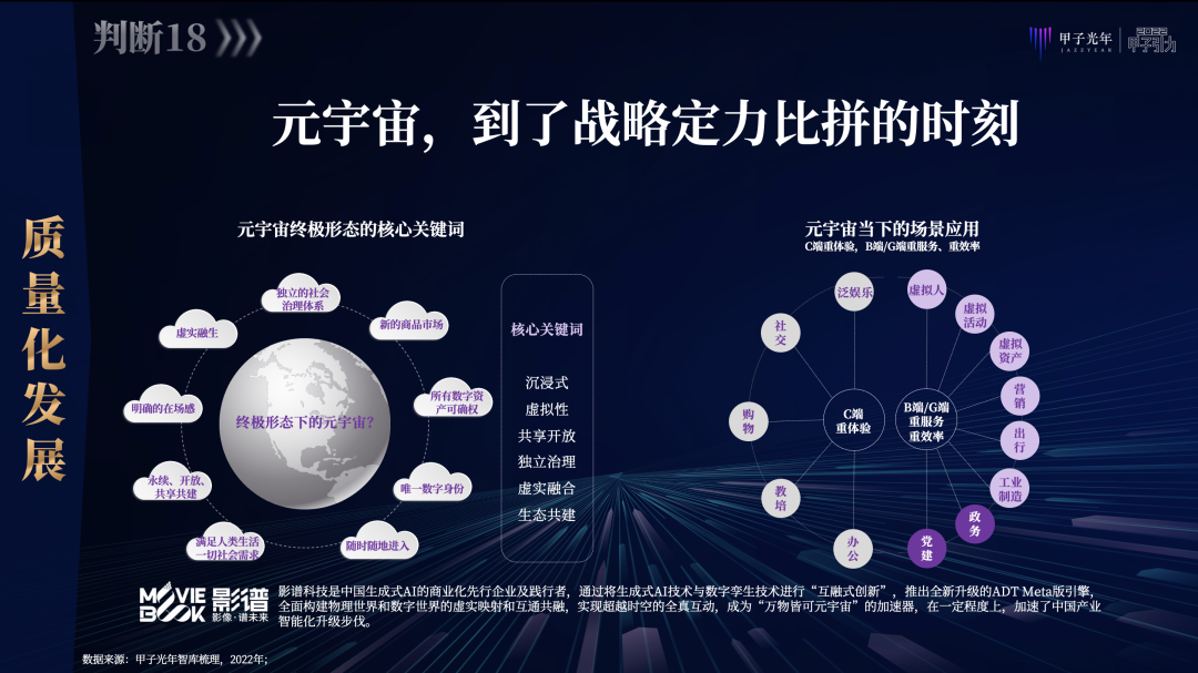 好在,我们已经看到了一些很扎实的案例进展。例如,影谱科技就在元宇宙的商业化实践上取得了技术和落地进展。其通过将生成式AI技术与数字孪生技术进行“互融式创新”,推出全新升级的ADT Meta版引擎,全面构建物理世界和数字世界的虚实映射和互通共融,实现超越时空的全真互动,成为“万物皆可元宇宙”的加速器,在一定程度上,加速了中国产业智能化升级步伐。