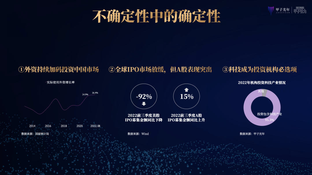 根据甲子光年智库2022年的调研数据显示,一级市场投资机构中有95.3%会投资科技赛道,从“顺势而为”到“势在必行”,科技已经成为投资机构的“必选项”。