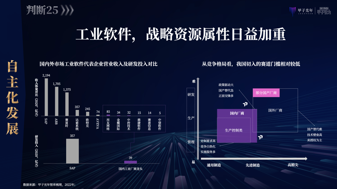 在过去,在偏底层的研发设计和生产控制类软件领域中,工业软件国产化率很低,面临“卡脖子”的风险。 近几年,我国工业软件整体处于“跟随者”阶段,好在,产品能力已经开始从门槛较低的领域突围向上,在局部赛道,一些公司已经初步具备向国外巨头发起挑战的能力,例如,中望软件、宝信软件、中控技术、苏州同元、达美盛、图为和中科辅龙 等等。