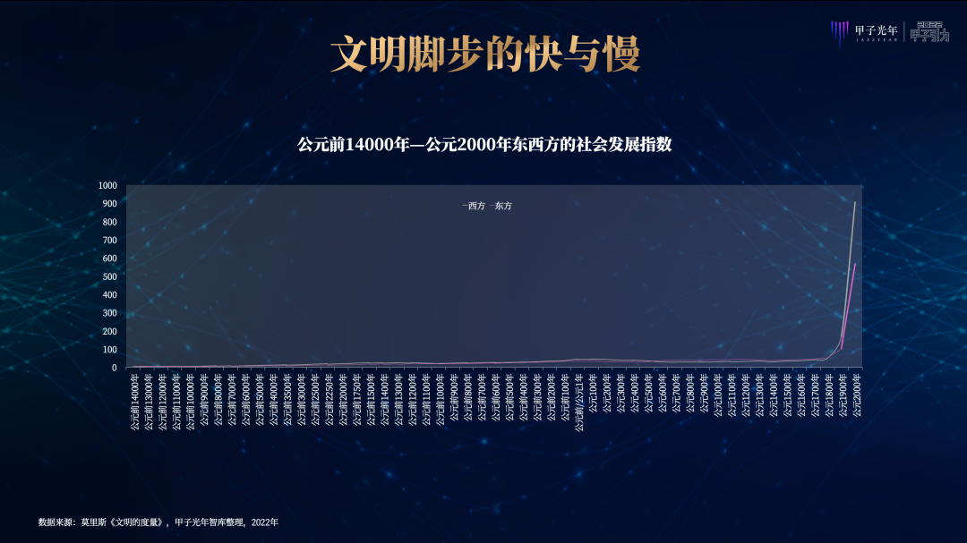 在《文明的度量》一书里,全球著名历史学家伊恩·莫里斯给出了从公元前14000年到公元2000年东西方的社会发展指数,如图,我们可以直观地感受到,文明其实爬行了上万年,是在最近200年间才突然变得陡峭的。